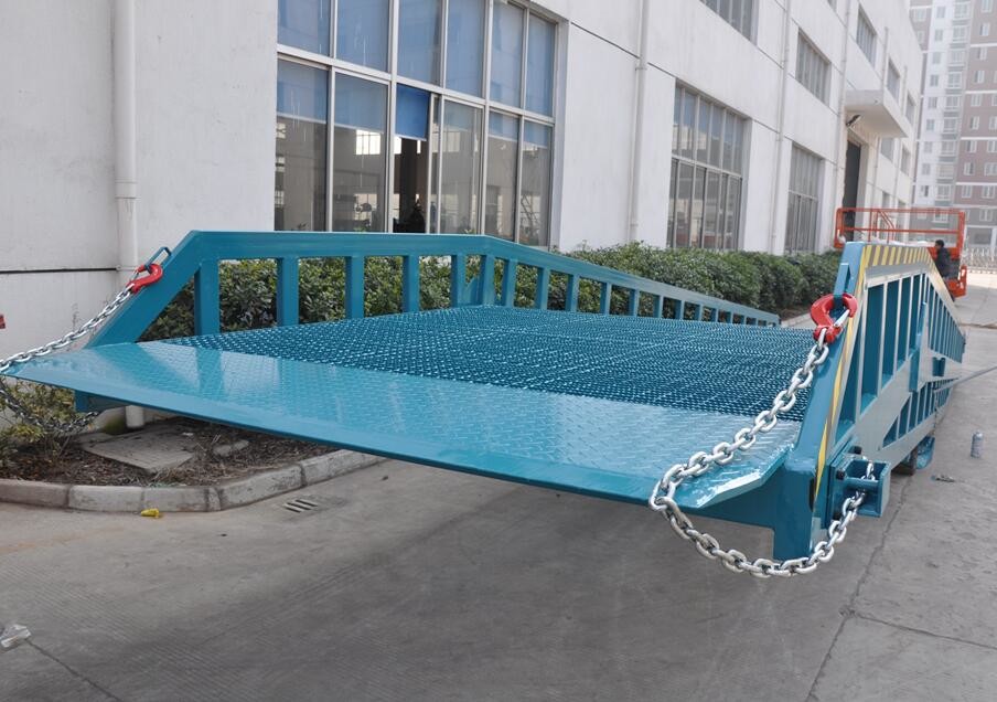 Mobile Dock Ramp is an auxiliary machine for loading and unloading cargo with forklift coordination use. The forklift can drive from the ground to the truck compartment to work directly through the Mobile Dock Ramp. There is no need to connect to power supply, for it uses manual hydraulic power. Only one man needed to manipulate the machine to load and unload goods safely and fast. And there is safety locking chain in the dock ramp to connect the machine to the truck and prevent moving when loading and unloading cargoes. With it, you can save abundant labor-using, increase the efficiency of loading and unloading, and speed up the flow of goods, then get more economic benefits.